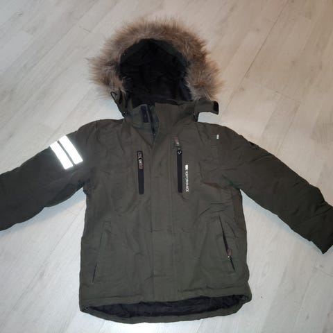 Tykk og varm vinterjakke, størrelse 130 ifølge merkelappen. Den er virkelig solid og fylt med en stor mengde dun.