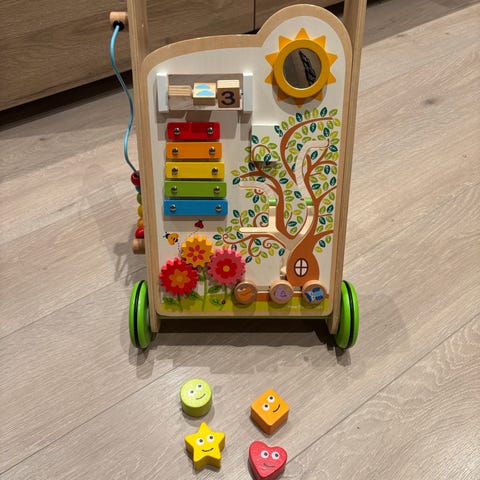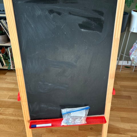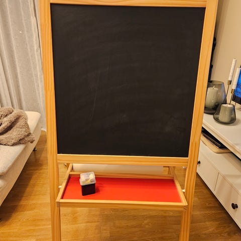 Flott justerbart staffeli i tre med magnet-og whiteboardtavle på en side og en morsom krittavle på andre siden. Beholdere for maling og tegnesaker. Kjøpt på Sprell. Aldri vært brukt mer enn første dag etter kjøp...