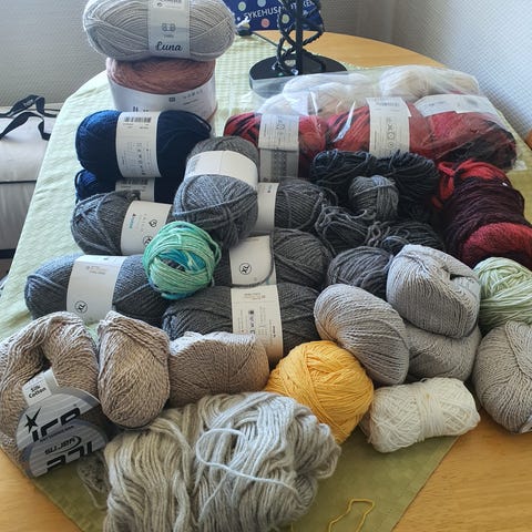 Stor garnpakke med flere farger og kvaliteter. 10 hele nøster av Kid silk i lilla, 4 hele nøster og 4 såvidt påbegynt av Sisu i hvit og brun, samt diverse rester. Inneholder garn i ulike farger som lilla, hvit, svart, beige, brun, gul og rødt. Garnet består av materialer som kid silk og andre ulltyper, egnet for strikking og hekling.