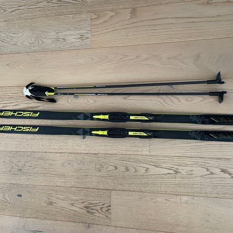 Selger et komplett og pent brukt langrennssett for barn fra Fischer, bestående av ski med feller 140 og to par matchende staver 90 cm og 95cm som passer perfekt for ulike alder.