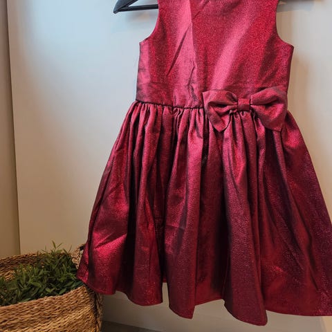 Superfin kjole i størrelse 122 for jente. Kjolen er blå og hvit stripete med mørke blå hjerter og har et mørke blått knyte bånd i livet. Passer til pent. Glidelås lukking i ryggen. Kjolen består av 100 % bomull.