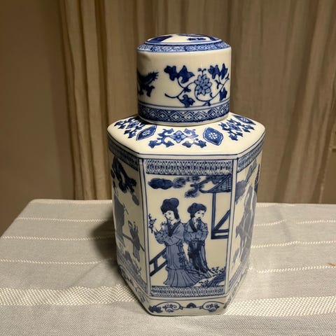 Kinesisk porselenskrukke med lokk dekorert med blomster og fugler