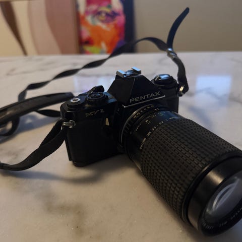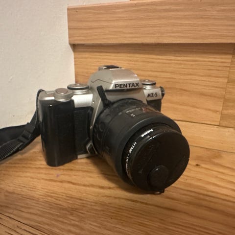 Pentax SLR-kamera med flere objektiver, inkludert SMC Pentax 2.8/28. Kameraet leveres med etui, blits, tilbehør og bruksanvisninger. Utstyrt med manuell fokus og designet for filmfotografering. Ikke brukt på mange år. Selges som det er