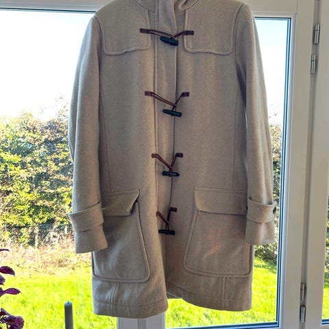 Selger en lys beige Burberry Brit dufflecoat i 100 % ull. Kåpen er kjøpt second hand og selges derfor til en gunstig pris. Den er pent brukt, i god stand og uten skader, men kan med fordel renses da den har stått i skapet en stund. Størrelse UK 12, som tilsvarer ca. 38/40 i EU.