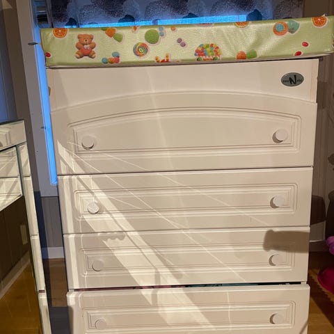 Hvit sprinkelseng som kan justeres i to høyder. Kan skrus ned og som på bilde.