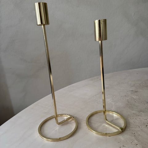 Vintage lysestake laget i messing, designet for å holde tre lys. Lysestaken har et rundt design med tre separate holdere for lys. Passer til dekorasjon i hjemmet eller andre rom. Naturlig patina og bruksmerker kan forekomme. H:7,6 cm Omkrets: 20 cm. Søkeord: vintage,retro,stue,interiør,dekor,design,dekorasjon,lysestake,messing,diverse,3-armet.