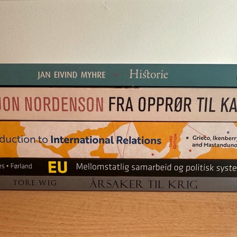 Flere pensumbøker til statsvitenskap, sosiologi, internasjonal politikk og andre samfunnsfag. Pris for hver bok står i beskrivelsen under bildene.