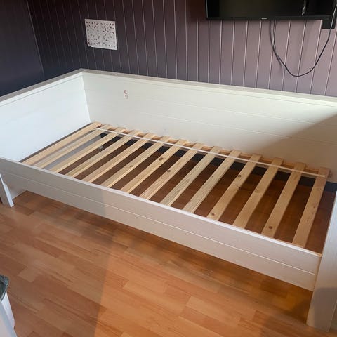 Det ene støttebeinet midt under sengen har knekt litt under flytting, men det funker helt fint hvis man støtter opp med en planke under.