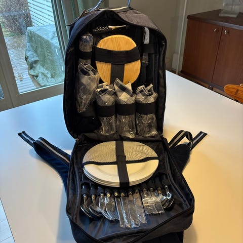 Praktisk piknikbag i svart med skulderrem (justerbar). To lommer med glidelås hvor den ene delen er kjølebag. Den andre lommen inneholder smarte lommer til å oppbevare blant annet vinflaske eller lignende, to vinglass, skjærebrett, bestikk etc. liten lomme på utsiden. Kun brukt 1 gang.