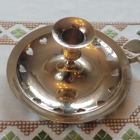 Vintage kammerstake i messing. H:6 cm. Omkrets: 10 cm. Naturlig patina og bruksmerker kan forekomme. Søkeord: vintage,retro,interiør,stue,dekor,dekorasjon,stilrent,bryllup,lysestake