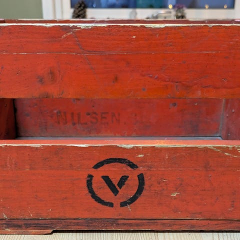 Kassen har flott patina og originale detaljer, inkludert metallskilt i front og håndskrevet merking på siden, som gir et autentisk retro-/industripreg.