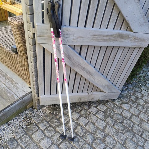 Rossignol skistaver for barn i svart med rosa detaljer. Stavene har ergonomiske håndtak med håndstropper og runde trinser nederst. Egnet til alpint/skikjøring for barn. 80 cm. Som nye. Selges for 140,-.