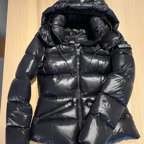 Mackage Madalyn dunjakke – str. S, i svart selges da datter har vokst ut av den. Veldig fin og varm jakke, med pen passform. Merket på armen kan taes av. Se siste to bilder.