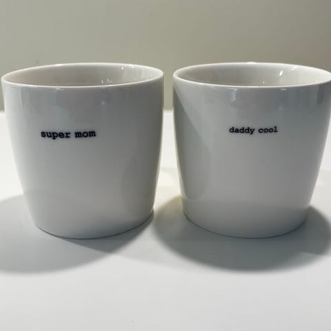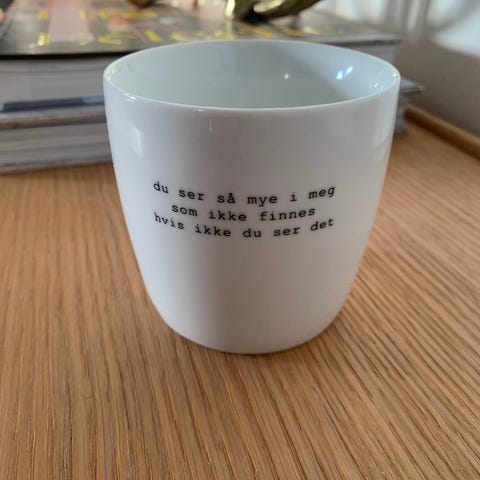 6 stk Sögne kopper/krus med hank selges samlet, 5 hvite og 1 mørkegrå. 2 av de hvite har sitater av Trygve Skaug. Som nye, men ene hvite med teksten «Dagen i dag kan bli min beste dag» har et veldig lite nagg øverst på kanten (zoom på bildet for å se). «Velfortjent», «Min», «Hverdagsmagi», «Livsnyter», «Hysj vær stille hører du lyden av meg som heier på deg».