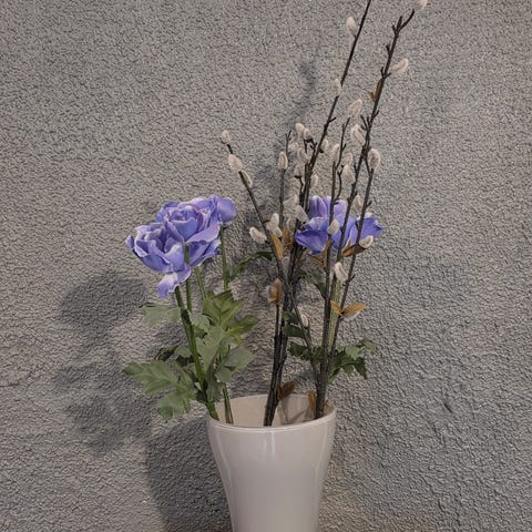 Selger en flott, høy hvit vase med tilhørende kunstige blomster.