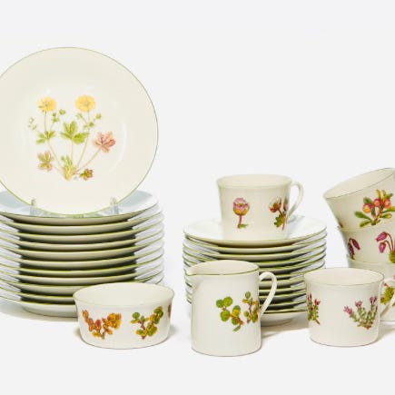 Nydelig kaffesett tegnet av Dagny Tande Lid, designet av Thias Eckhoff. Produsert av Porsgrund Porselensfabrikk. Fra 1980-tallet. 11 kopper med underfat og tilhørende asjetter, samt sukker- og fløtesett.