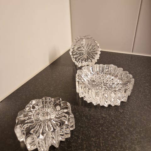 Hadeland Glassverk glasslykt med Finn mønster i klart glass. Lyktens form er avrundet med en bred fot og lokk, utstyrt med en veke for bruk som oljelampe eller dekorativt lys. Stått i skapet i lang tid, ikke vært brukt. Ingen feil på den.