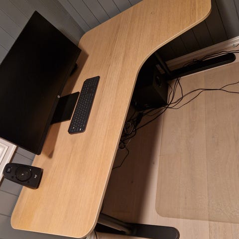 Høyde på pulten stilles ved å skrue på beina. Noen mørkere tone på høyre og øvre del av overflaten. Bak der printer har stått. Husker ikke hvor jeg kjøpte dem🙈