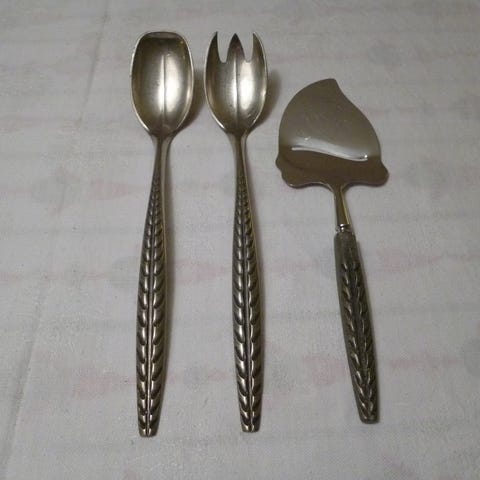 Salatbestikk i støpt tinn fra David Andersen med ornament fra Osebergskipet.