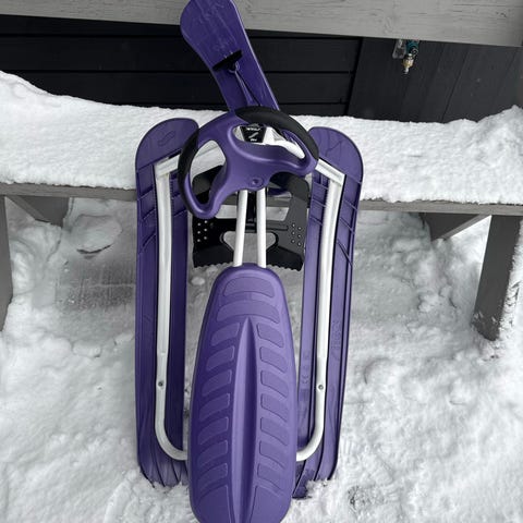 Denne har en knekt ski i fremre del, hvor det er mulig å kjøpe ny fra clas ohlson. Det mangler også fjær på denne. Selges lik den er