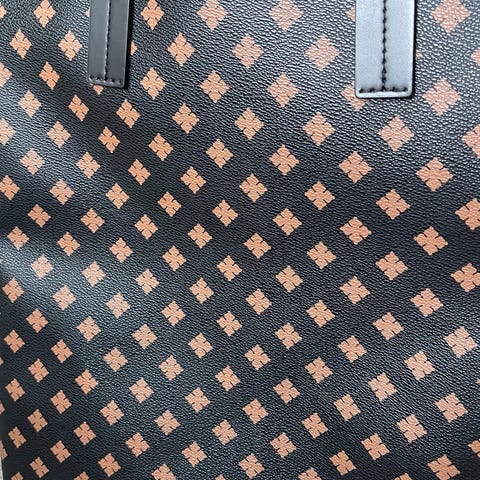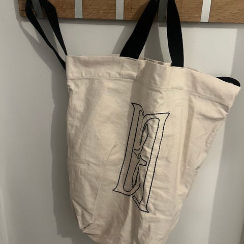 By Malene Birger stoffveske. Vesken har et mønstret stoffmateriale, med lange skulderstropper i svart. Innvendig er vesken lys med god plass til oppbevaring.