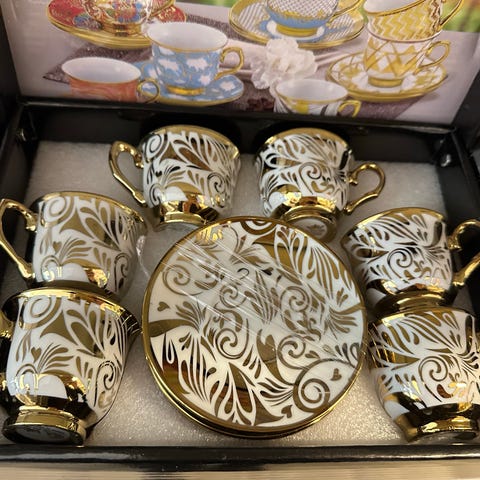 Royal Copenhagen kaffekopper med tilhørende fat. Kopper og fat har et mønster i gull og hvitt, med detaljer i gullfarge. Passer til servering av kaffe.
