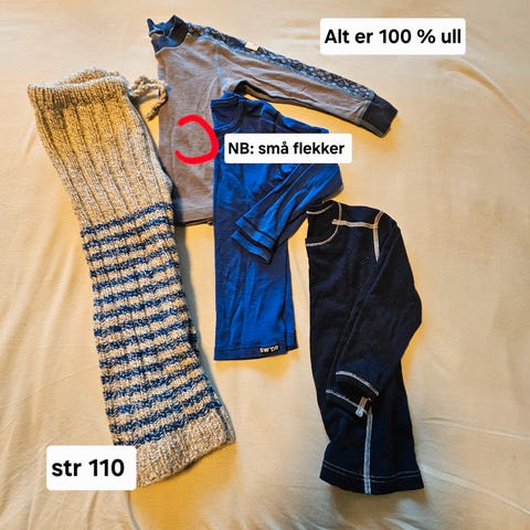 Klespakke med ull i str 110/116 selges. Noen andre str kan forekomme,men er brukt i samme periode.