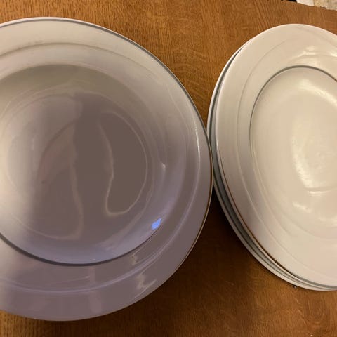 Tallerkener fra Firkløveren selges billig. Lite brukt 9 stk middagstallerkener 27 cm og 9 stk asjetter 22 cm selges samlet. Ingen hakk eller skader på noen tallerkener.