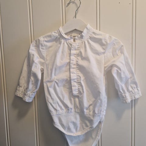 Søt liten skjorte til baby med knyting i halsen .Kan passe inni en kjole eller bunad. Nydelige detaljer. Litt slitasje på en søm forran. Jeg er litt usikker på størrelsen, men 62 ser riktig ut.