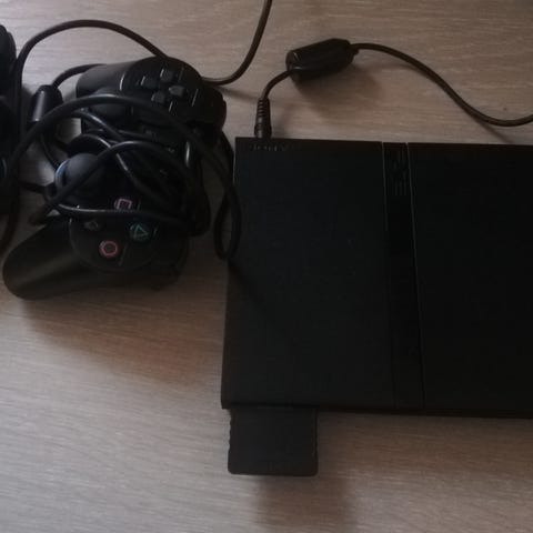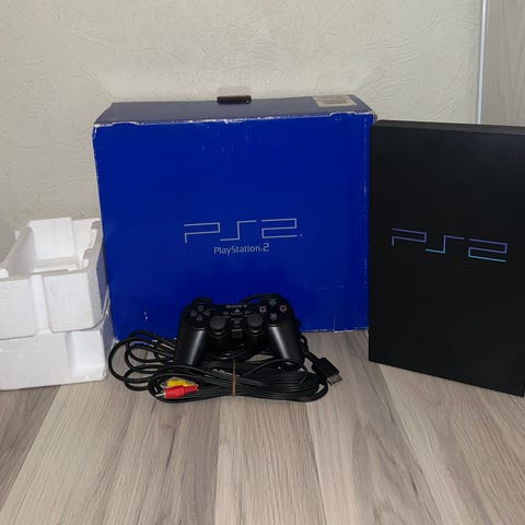PS2 konsoll med tilhørende kontroller, kabler, oppbevaringsveske og 4 spill. Spillene inkluderer Sonic, Cars og andre titler.