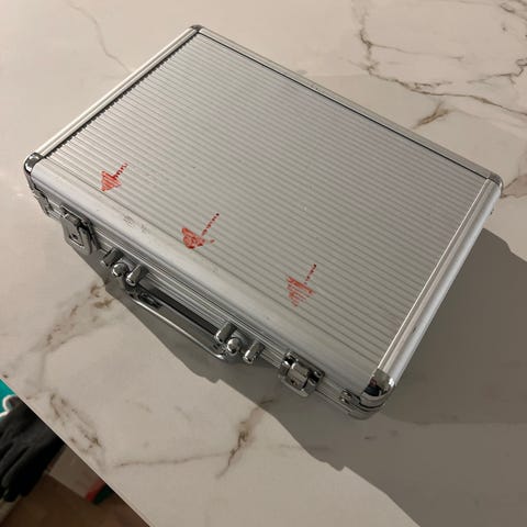Pokerchips sett som inkluderer flere fargede chips, to kortstokker og en solid koffert i aluminium. Kofferten har håndtak og låsemekanisme, og er designet for enkel oppbevaring og transport av pokerutstyr.