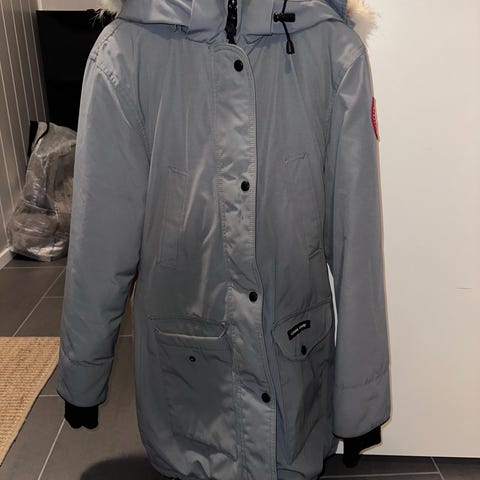 Canada Goose Expedition Parkas i størrelse S, svart farge, laget av dun. Jakken er designet for utendørs bruk i kalde forhold og har hette med pelskant.