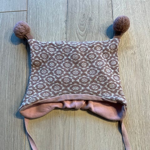 Kivat vårlue i rosa str 0-1. Den ene snoren er litt revnet etter maskinvask.