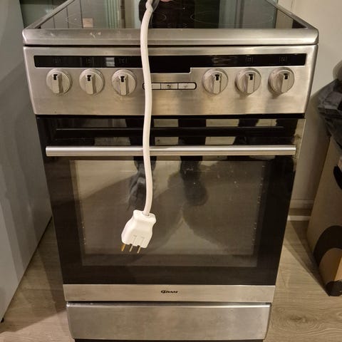 Electrolux keramisk komfyr med keramisk kokeplate. Komfyren har et enkelt design med to betjeningsknapper og en ovnsdør med glassfront.