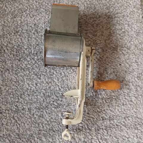 Fin gammel pent behandlet mandelkvern til å skrue fast på en bord eller benkekant Merket " Made in Sweden"