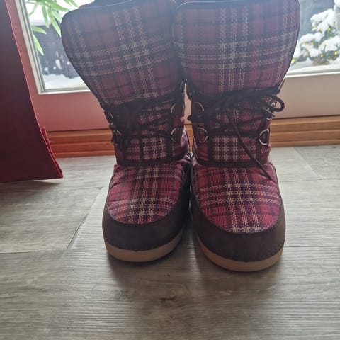 Moon Boot vinterstøvler i størrelse 39-41, rosa farge. Støvlene har rød snøring og er designet for vinterbruk.