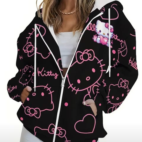 Fin Hello Kitty jakke i str L, romslig i str. Myk og deilig, den er tynn, kan brukes vår, sommer og høst. Kan hentes el jeg sender