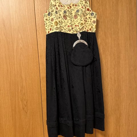 Kjolen har ermeløs design med detaljert mønster i stoffet. Passer for kvinner og kan brukes til ulike anledninger.