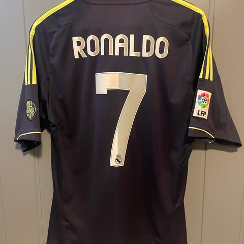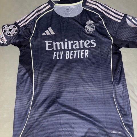 Adidas Real Madrid fotballtrøye i størrelse M. Trøyen er svart med mønster og har korte ermer. Egnet for fotball.