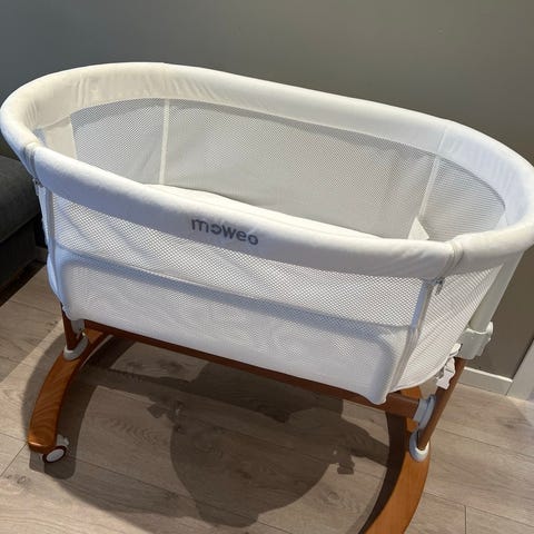 Moweo Bedside crib i grå farge. Kjøpt i 2025. Brukt til 1 barn. Nyvasket trekk til madrass. Ingen synlige skader/merker. Trekk, stropper og bruksanvisning følger med. Må hentes. Vi slår den sammen slik du ønsker før henting (må ikke demonteres helt for å enkelt få inn i bil).