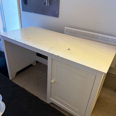 Fin hvit pult uten synlige skader bortsett fra hakk midt i som vist på bilde. Vi har brukt å ha skrivebords beskytter over- det har fungert bra.