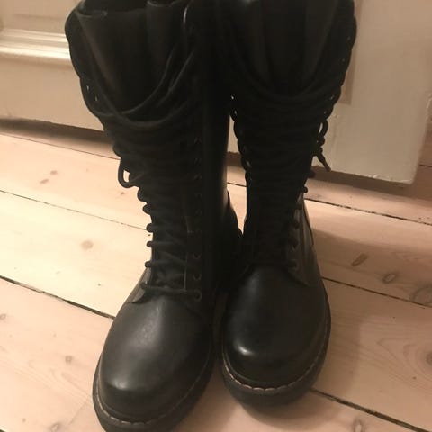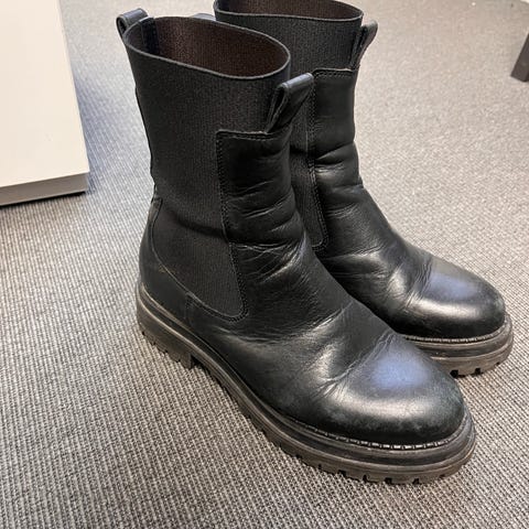 Stockholm Design Group støvler i størrelse 37. Støvlene er svarte og har en tekstur som ligner krokodillemønster. De har en solid såle med godt grep, og elastiske partier på sidene for enklere på- og avtaking.