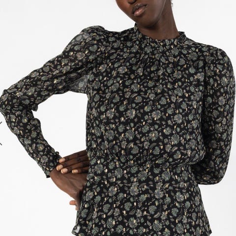 Camilla Pihl bluse i et vakkert monster i gråblå og burgunder. En feminin utringning og fine detaljer på skuldre.