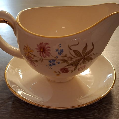 Dekoren er hel og fin uten slitasje, og det er ingen hakk eller skår i glass eller mugge etter det som kan sees.