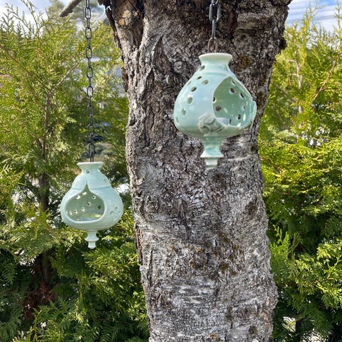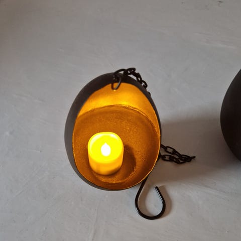 Håndlaget Hengelykt og lysestake i keramikk, fra Glit HF. Medfølger 2 kjettinger til oppheng