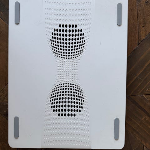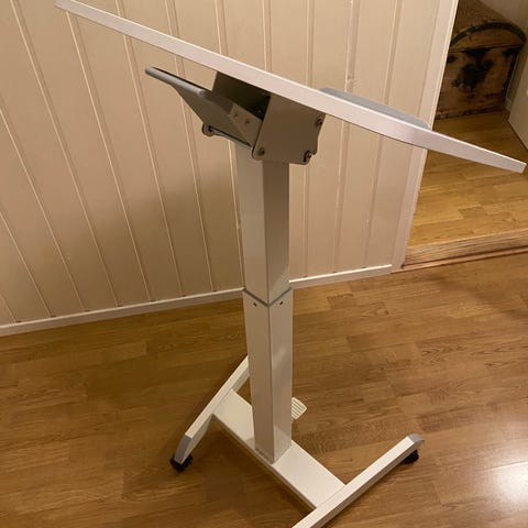 Justerbart bord med svart trekantet bordplate og metallramme. Bordet har håndtak på bordplaten for enkel flytting. Passer til bruk som sidebord eller laptopbord. Må hentes.
