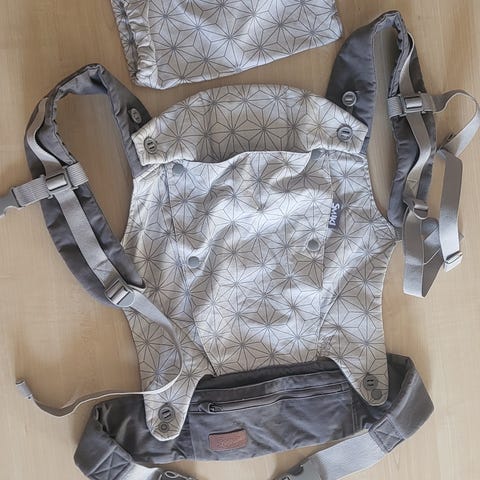 Brukt SMIKI-bæresele i grå og kvit farge. Ergonomisk modell som eignar seg for barn opptil 15 kg, og kan brukast frå rundt 3 månaders alder.