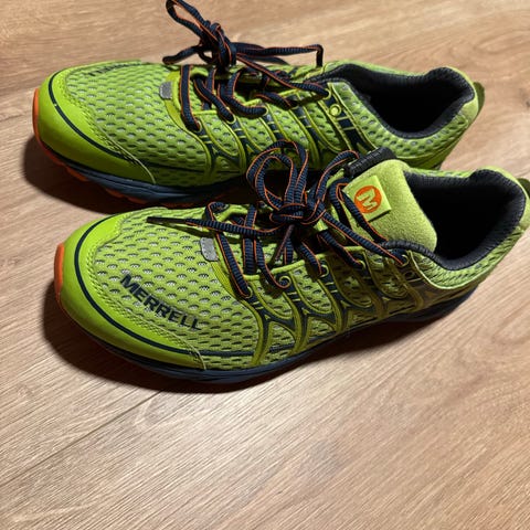 Merrell Flo? løpesko i størrelse 43 med svart farge. Skoene er designet for løping og har såler med godt grep. Materialet og konstruksjonen er tilpasset for sport og aktivitet.