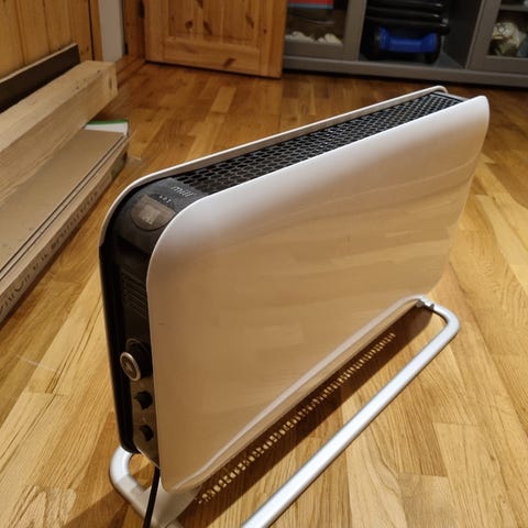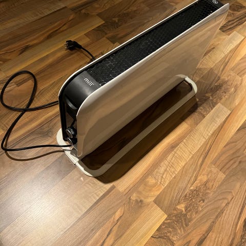 Uten synlige merker, Mill gen 2 listovn. Elektrisk varmeovn med digitalt display og wifi-tilkobling. Enheten har kontrollpanel med knapp for temperaturinnstilling, wifi-aktivitet og timerfunksjon.