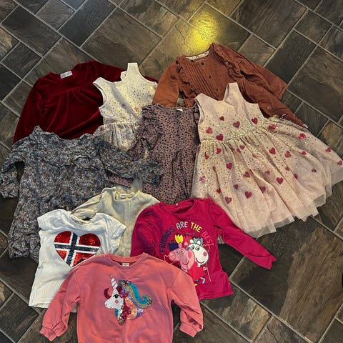 Stor klespakke med diverse. Mesteparten av klærne er i størrelse 104. Flekker på noen av plaggene kan forekomme.